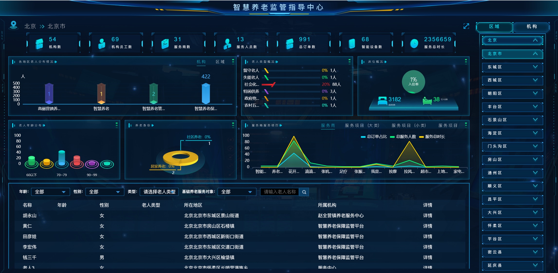 居家養老運營決策大屏、機構養老運營決策大屏、健康畫像大屏、呼叫中心大屏、明廚亮灶大屏、大數據綜合大屏、自定義綜合大屏、志愿者大屏、養老資源監管大屏、報警調度中心大屏、老人數據分析大屏、機構視頻監管大屏、健康巡診可視化大屏。